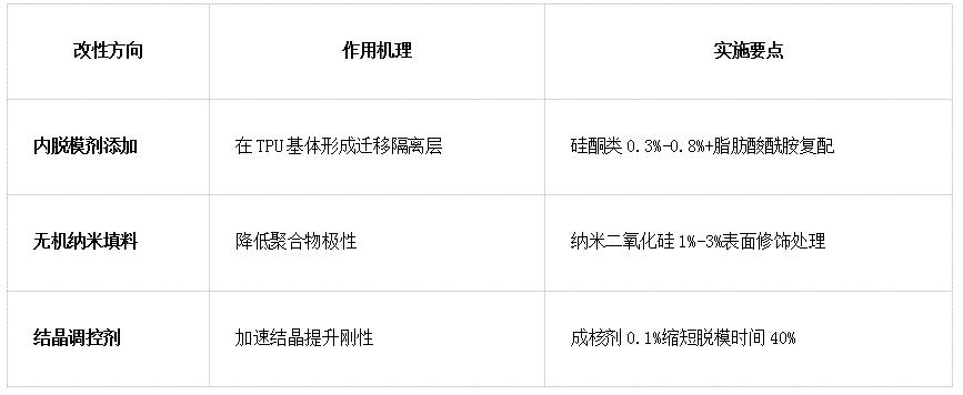 技術(shù)本質(zhì):降低TPU粘模風(fēng)險(xiǎn)的核心在于打破分子間作用力鏈。表層通過(guò)納米工程構(gòu)建物理隔離屏障,材料本體借助改性劑切斷極性鍵合路徑,配合注塑參數(shù)精準(zhǔn)抑制粘彈滯留效應(yīng)。