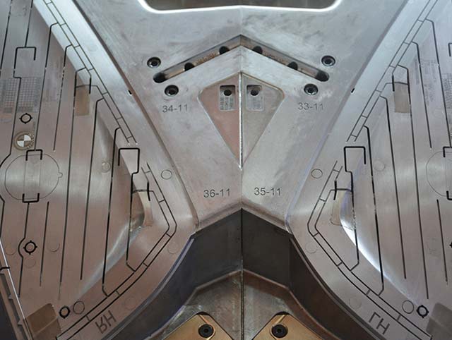 BMW end cap 1000T大型雙色模具,前模頂出需要開模同時沿分型面頂出,合模需要分型面推前模頂出系統(tǒng)回位,經(jīng)過我們工程團隊前期跟客人提出的有效建議對產(chǎn)品的優(yōu)化,結(jié)果模具試模一次成功。
